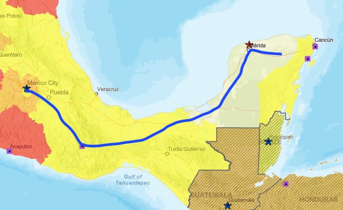 Yes! Really! The U.S. State Department maintains a very detailed, state by state, city-specific travel advisory for Mexico. In this article, just as our own trip through Mexico in March 2023, we took the path in blue below. Most of Europe is yellow, level 2 (“exercise increased caution”), and only a very few countries are level 1, like Scandinavia…and the Yucatan and Campeche (“exercise normal precautions”). Here is a screenshot of the State Department’s map of Mexico, with our trip in blue below. It really is no more dangerous than traveling around the U.S. or Europe!